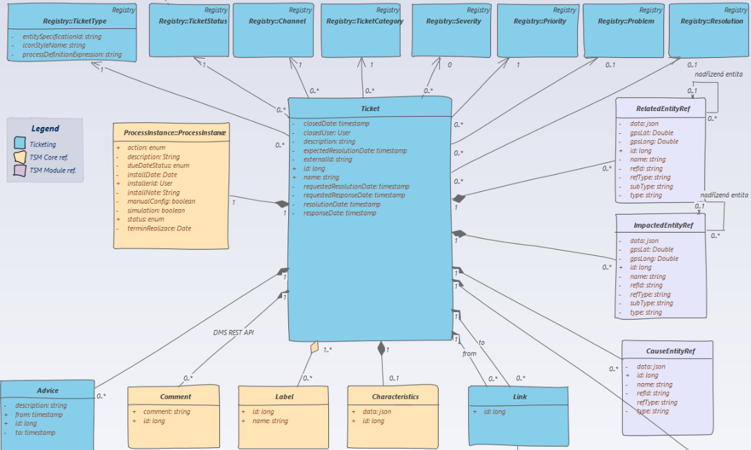 The Ticketing module illustrates this approach well. The diagram below shows the TM Forum Trouble Ticket data model as defined by TMF621 — the entity structure that tSM adopts and extends:
